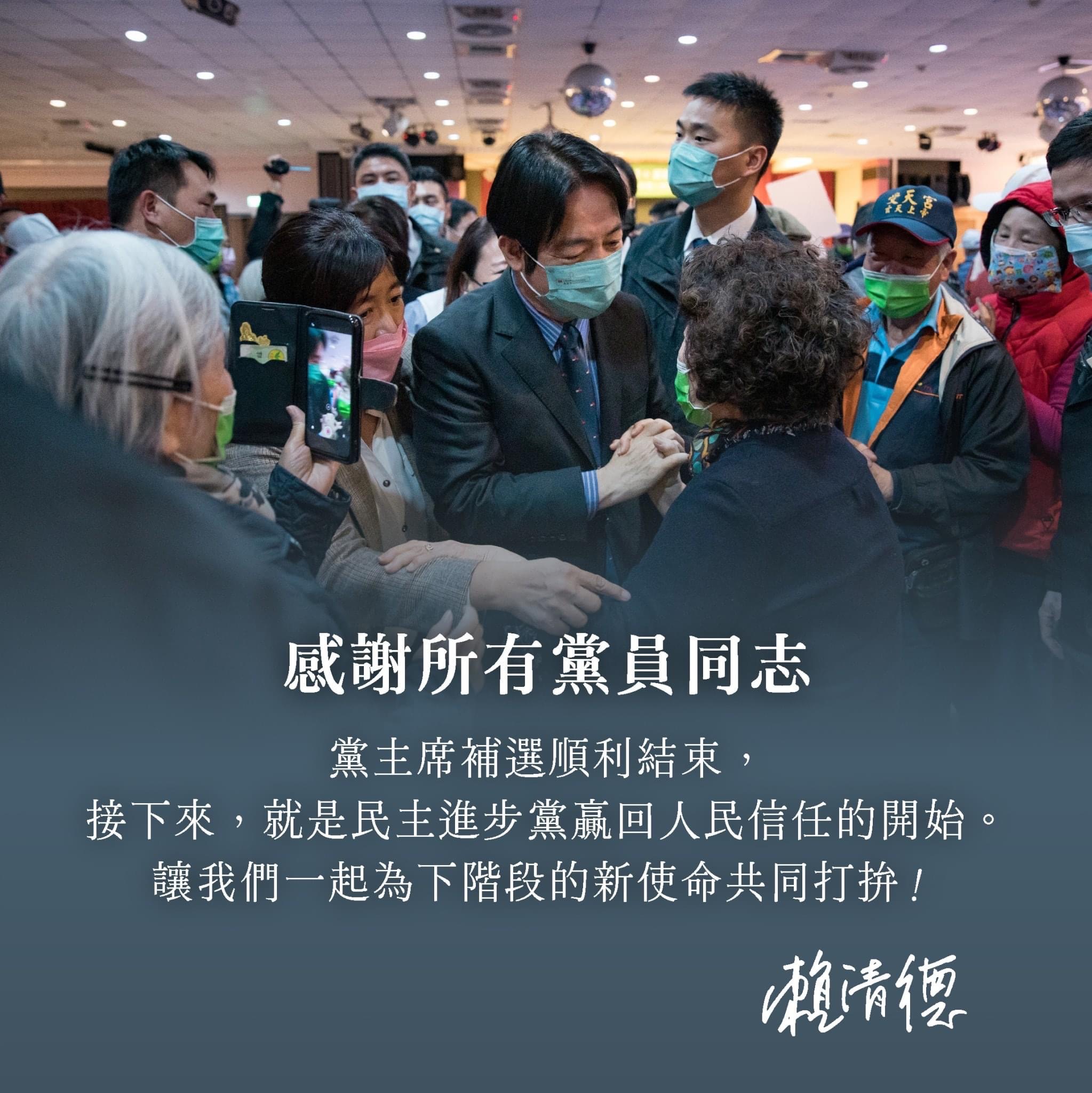 民進黨主席補選結果出爐,副總統賴清德以4萬1840票同額當選,此次選舉有投票權的選舉人數共有23萬8664人,投票率約17.59%。
