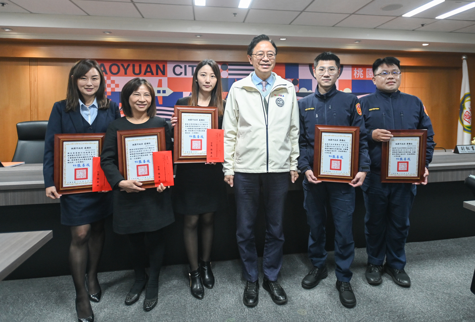 桃園市長張善政今(15)日上午主持市政會議,表揚「桃園市112年1月成功攔阻特殊重大詐騙案件有功人員」。張市長表示,今日共表揚3名有功銀行人員及市府警察局2名有功員警,感謝他們發揮警覺性,成功攔阻詐騙,相當值得嘉許。