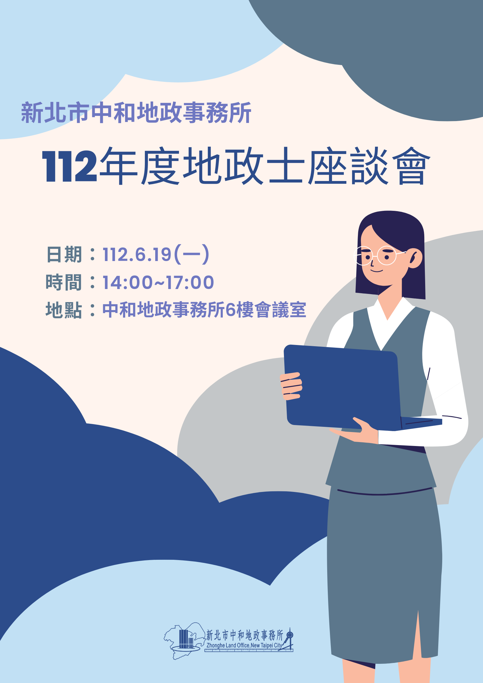 為強化與地政士間互動交流,並宣導政策與法令,新北市中和地政事務所訂於112年6月19日(星期一)下午2點於該所六樓會議室(中和區復興路278號6樓)舉辦112年度地政士座談會,歡迎地政士及不動產相關從業人員踴躍參加。