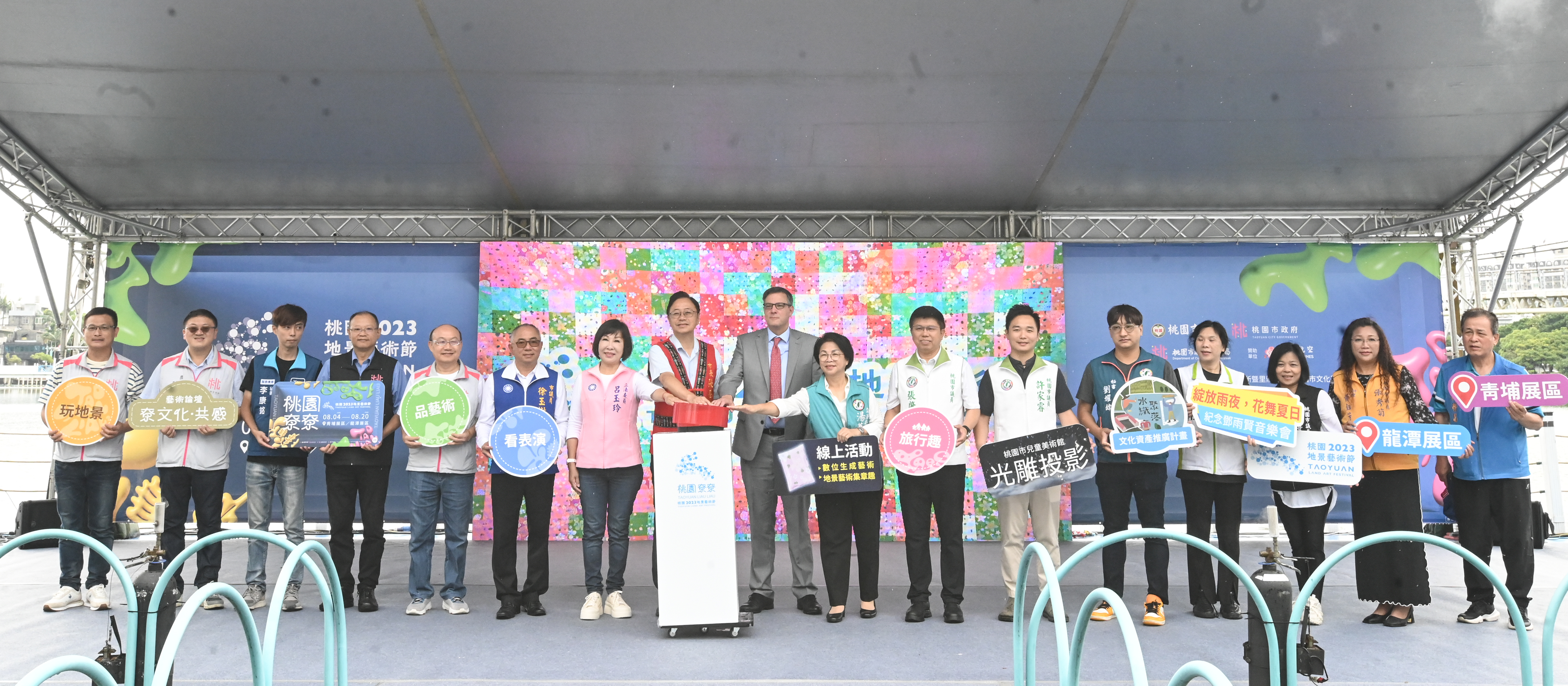 桃園市長張善政今(1)日上午前往龍潭區,出席「桃園地景藝術節開幕式」。張善政表示,8月1日是「原住民族日」,他今天特別穿上繡有原住民圖騰元素的背心,希望向族人致意。桃園地景藝術節今(112)年邁入第11屆,已在台灣享有盛名,今年地景藝術節以「桃園尞尞」為主題,邀請許多海內外藝術家與在地民眾、學校、宮廟等創作許多美不勝收的地景藝術作品,並在龍潭大池、老街區及龍潭運動公園規劃「龍潭展區」(展期:8/4-8/20),同時配合即將登場的「世界客家博覽會」設置「青埔展區」(展期:8/11-10/15),期盼能吸引國內外朋友共襄盛舉,讓「桃園地景藝術節」成功邁向國際舞台,成為台灣及桃園的驕傲。