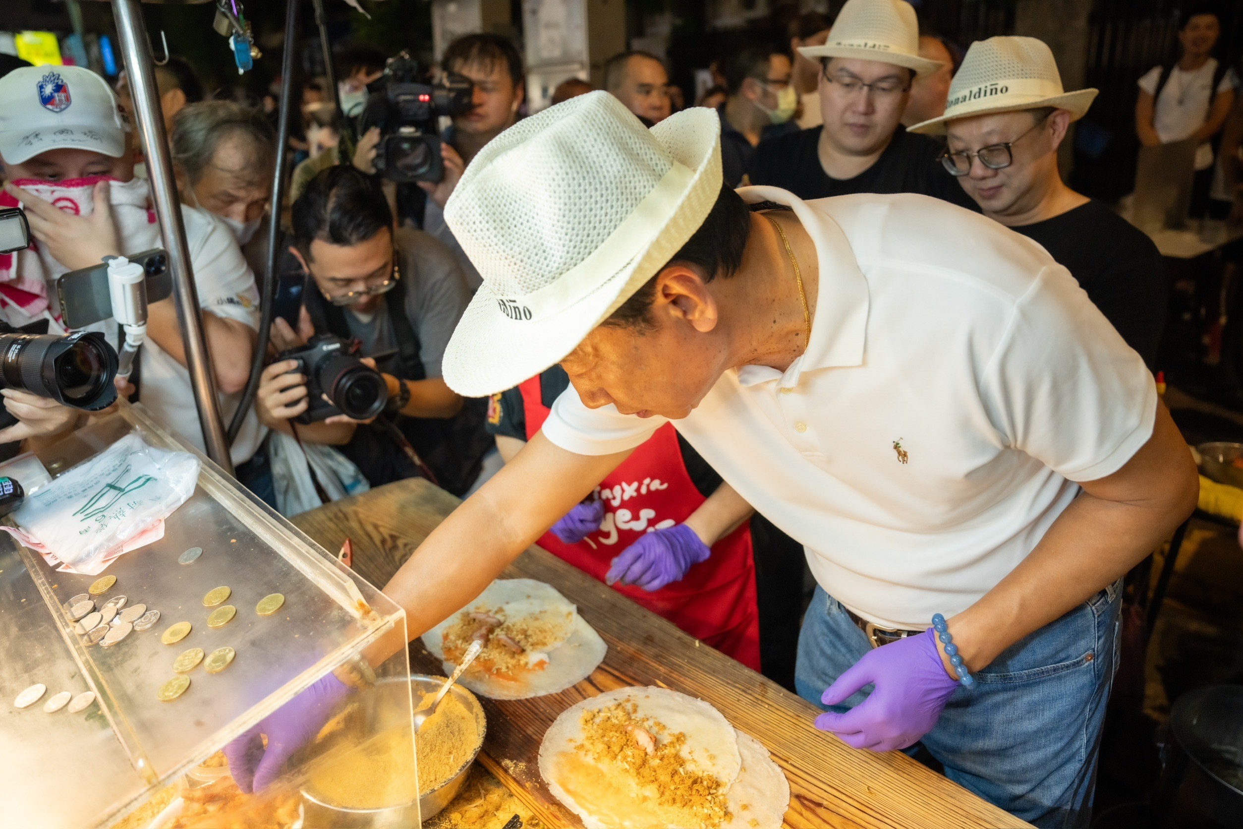 郭台銘不僅試吃美食、試作潤餅,更挑戰大胃王「千歲宴」蚵仔煎的大桌菜。