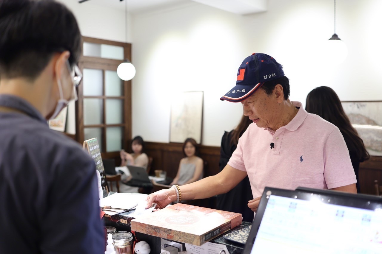 郭台銘在赤峰商圈理事長陳靜筠陪同下「文青走讀」,到獨立書店「奎府聚」買書,包含「異人茶跡」全套、「來自清水的孩子」全套、「台味飄撇:食好料的所在」、「世界珍稀古地圖中的臺灣」。