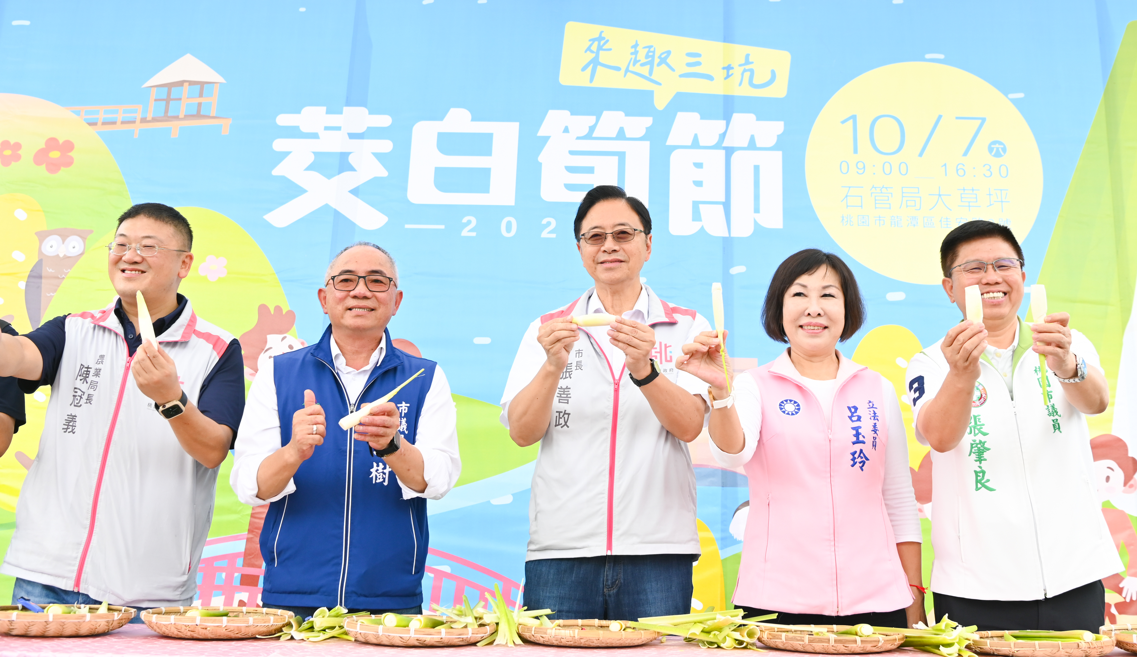 桃園市長張善政7日上午前往龍潭區石管局大草坪,出席「來趣三坑茭白筍節」。張市長表示,龍潭三坑好山好水,秋季正值茭白筍收穫時節,而三坑茭白筍殼薄、纖維細,口感脆甜爽口,是全台最優質的茭白筍。今(112)年市府農業局、龍潭區農會與大石門休閒農業發展協會合作無間,辦理「112年度龍潭區三坑水鄉茭白筍節活動」,並規劃系列活動,除了供市民朋友在農民市集採購茭白筍外,亦有草地音樂會、尊巴舞帶動跳、數梯次的茭白筍剝殼比賽,更有廣受遊客喜愛的農遊小旅行,相信參加的朋友將滿載而歸,也希望所有鄉親到龍潭三坑地區購買台灣最優質的茭白筍。