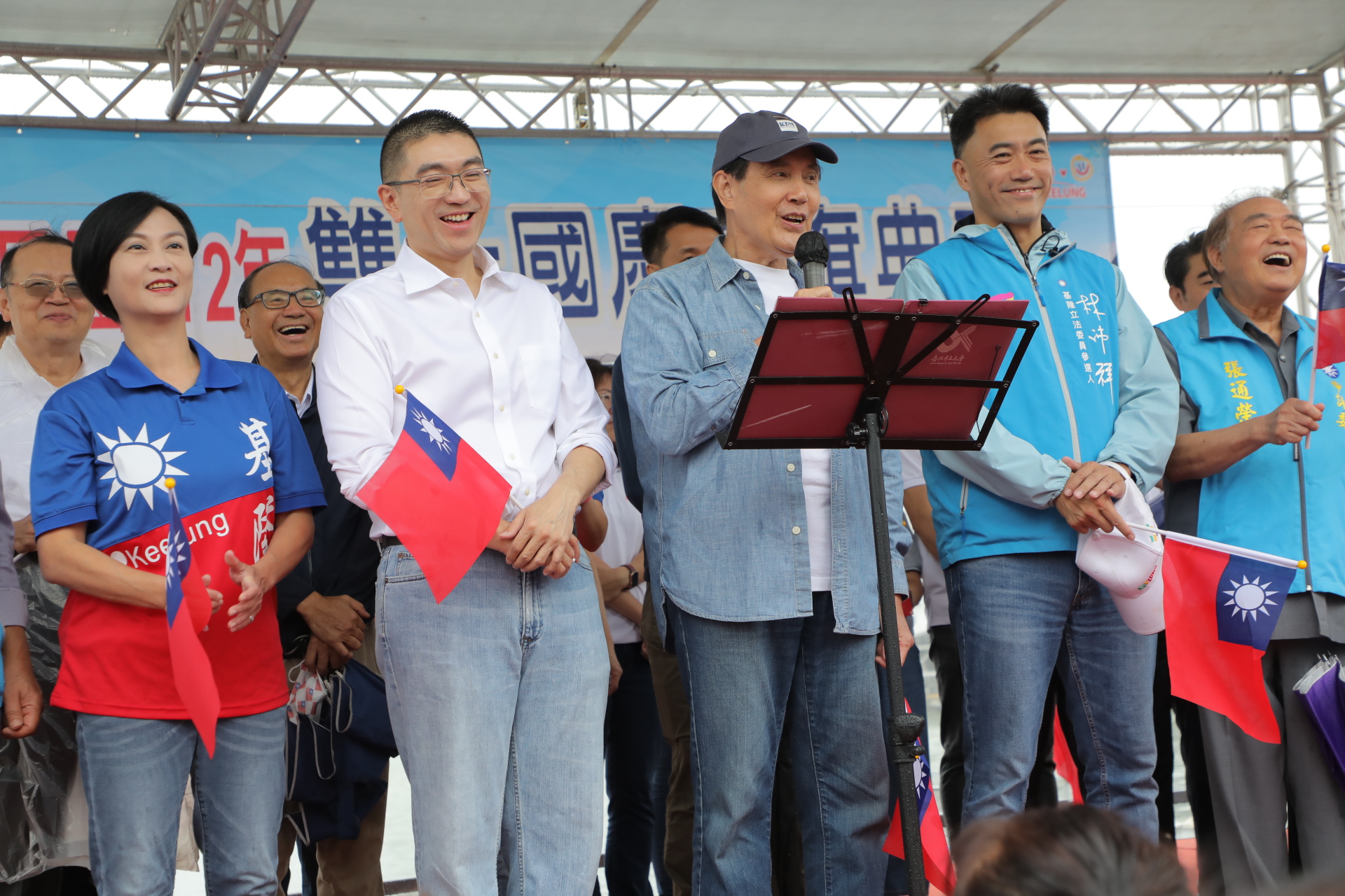 基隆市政府為迎接雙十國慶,10日上午在海洋廣場舉行「國慶升旗典禮活動」,儘管天公不作美,但仍無法澆熄數千位熱愛中華民國的市民朋友參與熱情,謝國樑市長與前總統馬英九更與在場立委、議員,一起在台灣頭唱出對國家的熱愛。