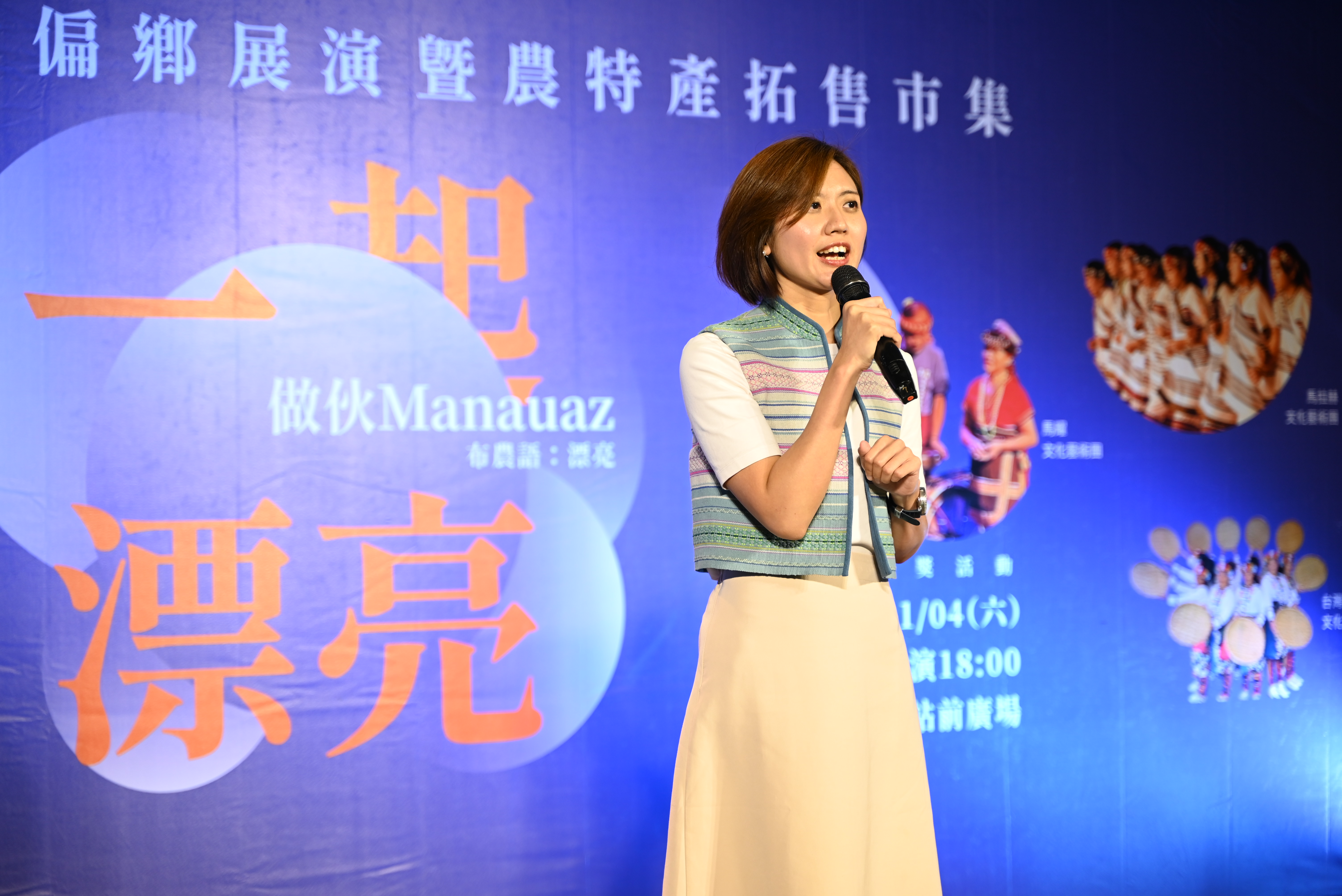 新北市原民局11月4日晚間於新北市瑞芳火車站前廣場,辦理今年度的原住民族表演藝術偏鄉展演暨農特產拓售市集活動「一起漂亮.做伙Manauaz(布農語:漂亮)」,由5組新北原民局培力之原民表演團體,依序揮汗演出,圓滿展現培訓成果,原民局長林瑋茜Siku Yaway也與市民朋友一同觀賞演出,感謝團員們在新北市都會區傳承原住民族樂舞文化的努力與付出,也希望透過本次演藝團隊首度走出劇場,帶來一系列戶外展演,讓社會大眾透過樂舞,對原住民族文化及歷史有進一步的認識。