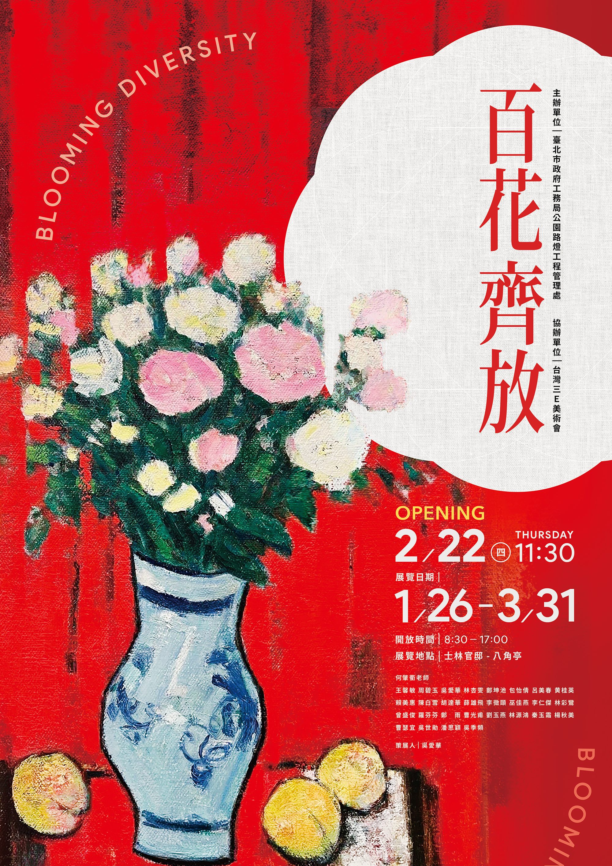 公園處處長藍舒凢表示,台灣三E美術會於2023年首次和士林官邸菊展合作,舉辦「菊花開了」畫作聯展,花展和繪畫藝術的結合,令參觀民眾耳目一新,也廣受好評,這次更進一步,「百花齊放」迎接2024年的新春,以花卉為主題,作品更多元,包含鬱金香、牡丹花、玫瑰、百合、荷花、蓮花、波斯菊、百子蓮還有意象花等,可謂百花爭艷! 展期涵蓋士林官邸春節花卉展、鬱金香展、玫瑰季,讓您賞花又賞畫,感受虛實不同的美感!