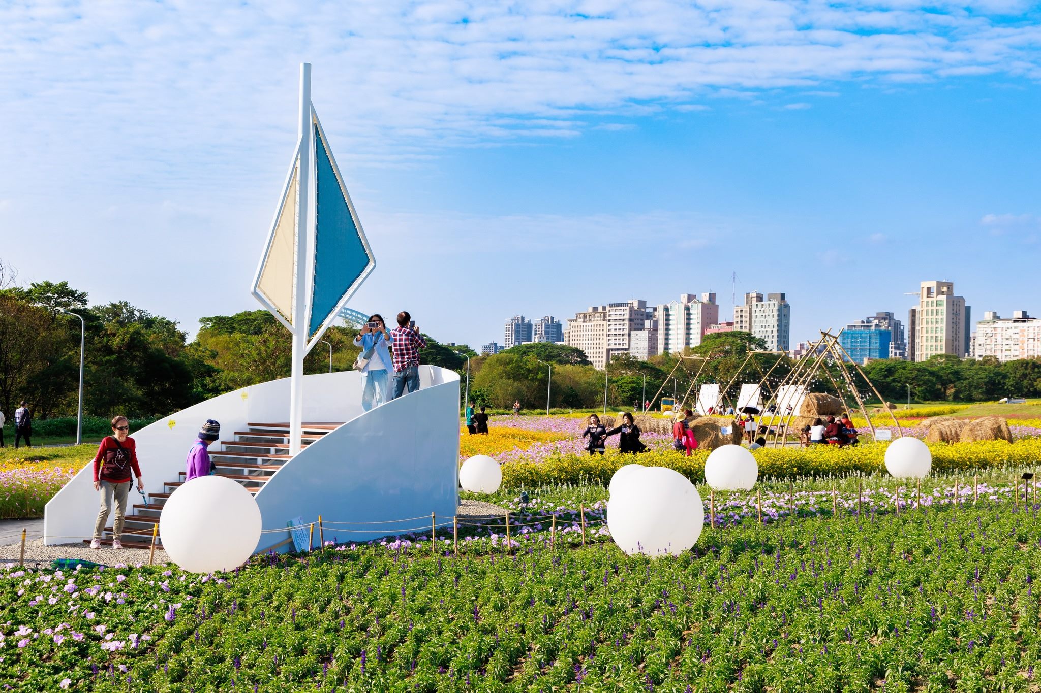 古亭河濱花海一直是北市賞花的必訪景點,今年還增加了許多裝置藝術,讓花海更有看頭!包括:大型的船型瞭望台和多達49個稻草捆,都讓拍照更有特色;傍晚時分,現場大型彩色球燈亮起,加上串串燈光點綴的帳篷,都也讓花海洋溢著另一種夢幻氛圍。