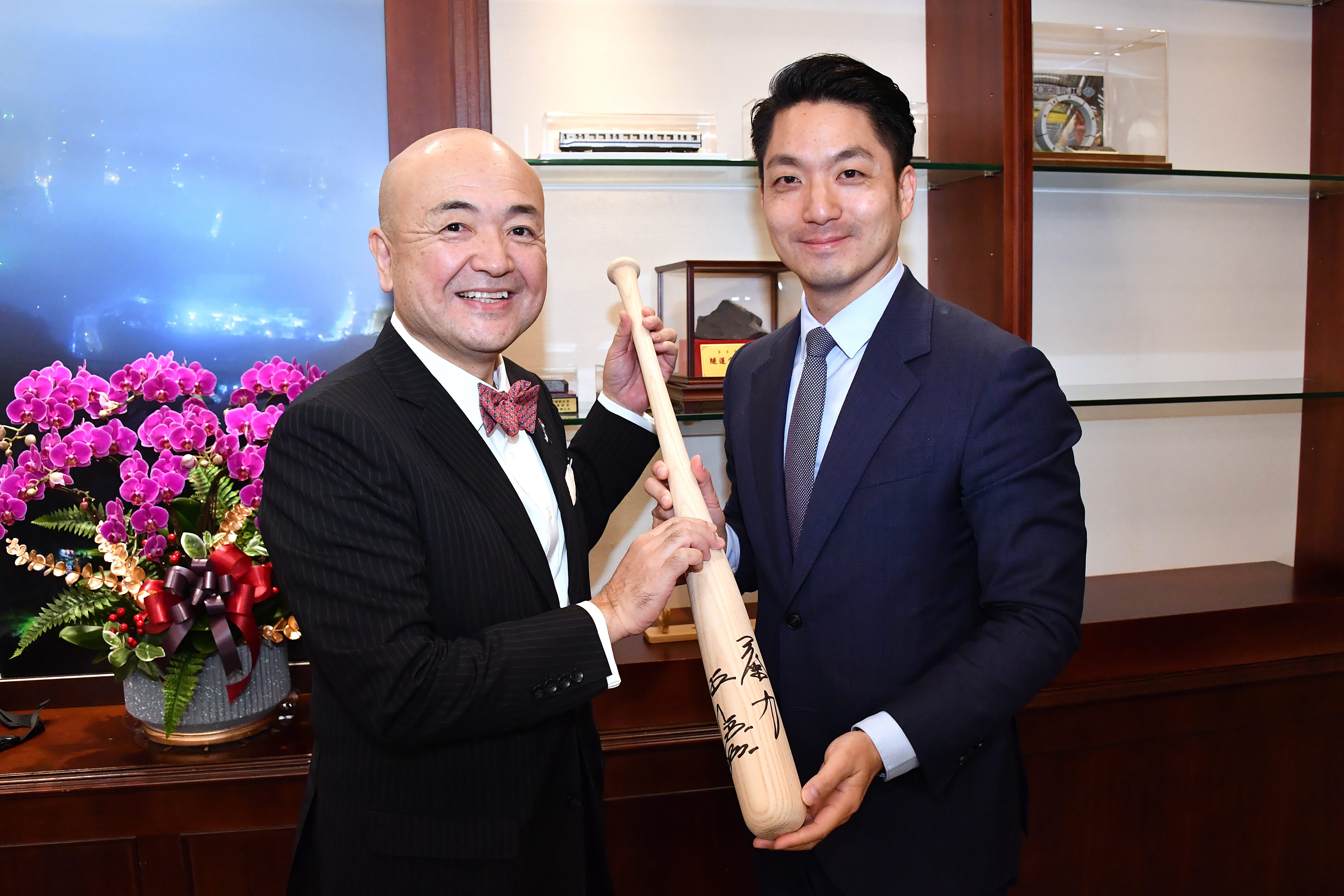 席間,片山代表透露他最喜愛的棒球選手即是王貞治,蔣市長也向片山代表分享王貞治先生日前出席臺北大巨蛋替亞洲錦標賽開球一事,並展示陳列於市長貴賓室之王貞治先生親筆簽名球棒,片山代表亦開心與簽名球棒合影,會談氣氛輕鬆融洽。