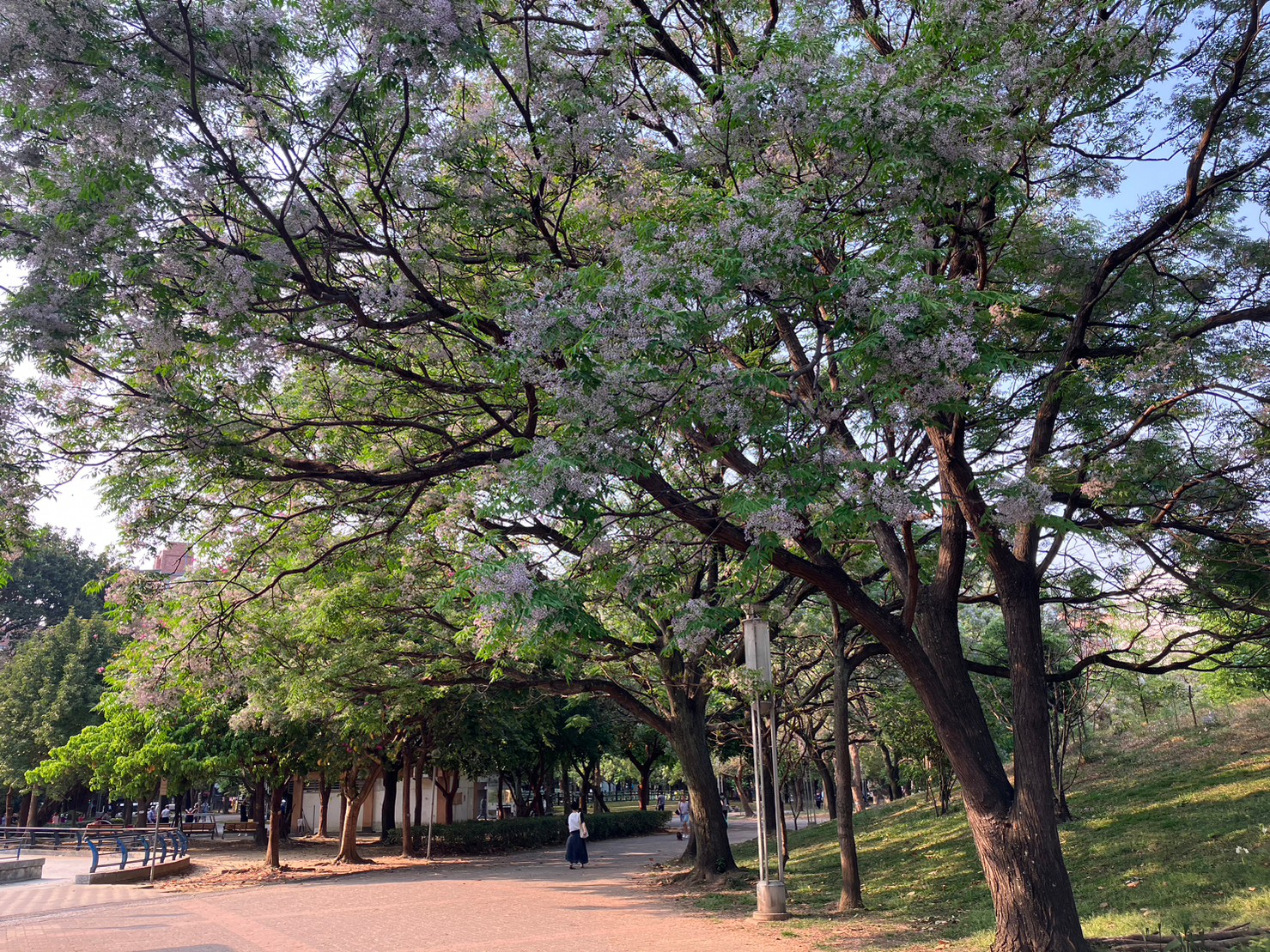另一處,位在捷運板南線土城站1號出口的斬龍山遺址文化公園,也揚起淡淡楝香,滑梯旁的楝樹,樹形優美,花朵遠看似霧,近看似雪,花瓣呈淡紫色,還會散出似洋玉蘭的香味,隨風搖曳隨雨落,輕柔淡雅讓人如醉癡迷。