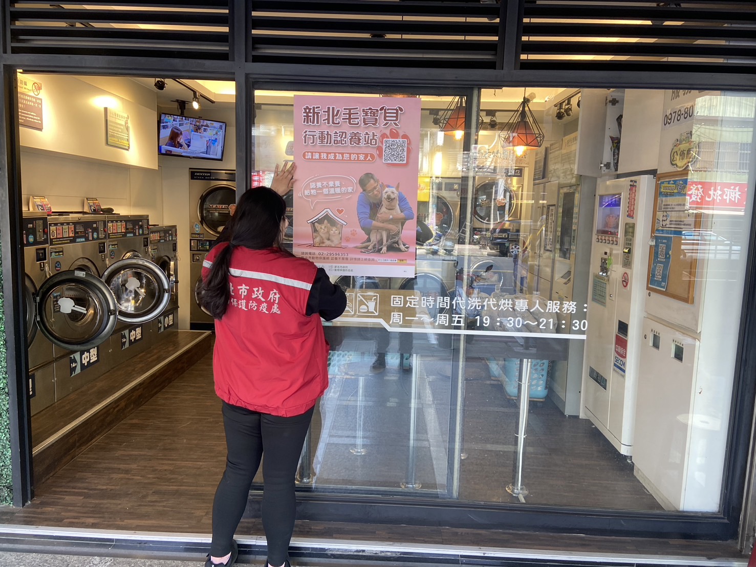 新北市政府動保處為讓毛寶貝都能找到溫暖的家,於4月4日「世界流浪動物日」與洗衣店、旅行社及餐飲等共計780間商家企業擴大合作推動行動認養小棧,於商家張貼行動認養小棧海報及立牌,讓民眾在消費的時候就可以透過掃描QR Code進入動保處官網認養平台(https://act-adopt.ahiqo.ntpc.gov.tw/),查看目前在等待認養中的犬貓幫助增加其曝光率,讓在動物之家的犬貓們都能儘快找到幸福的下一站。