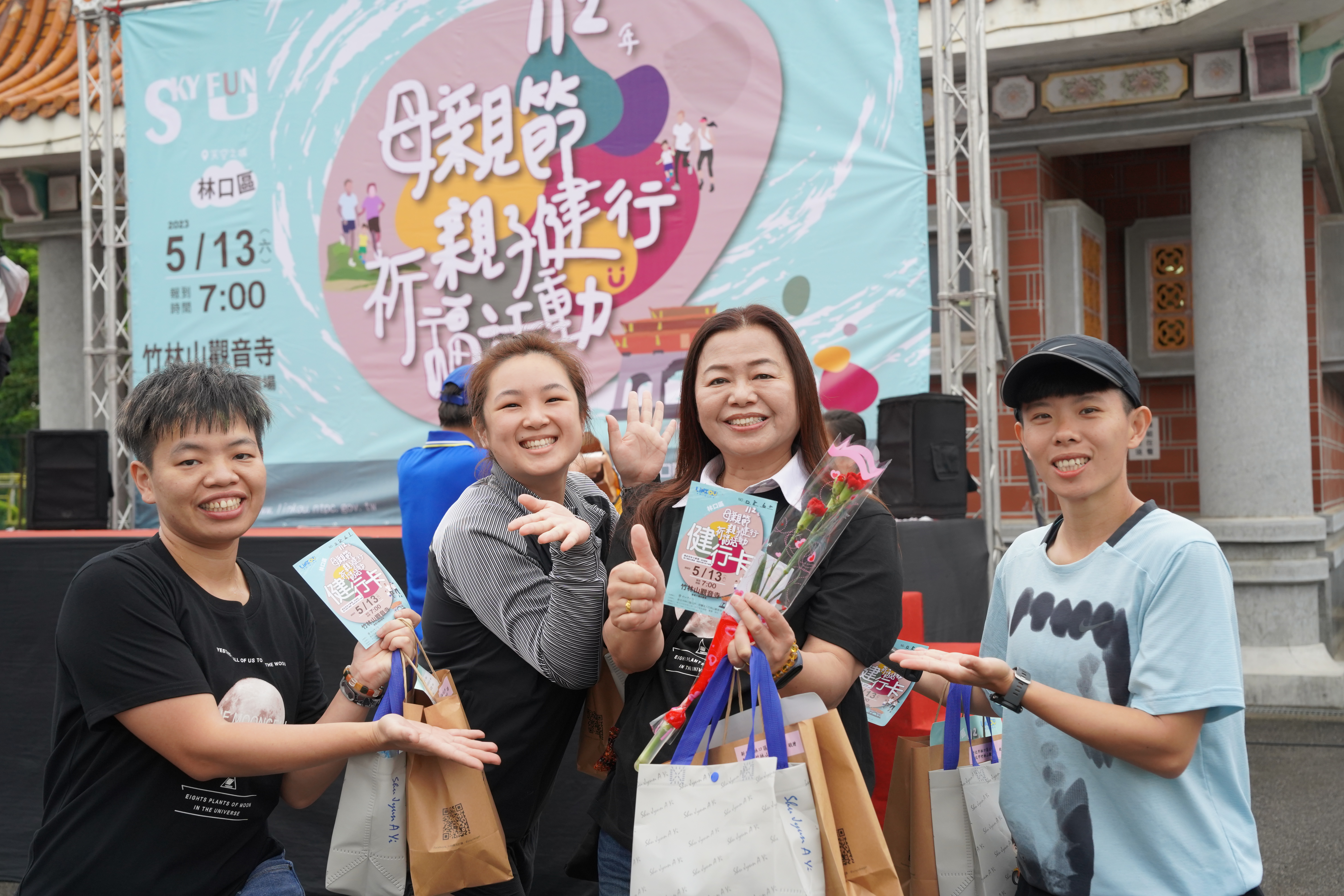 林口區長廖武輝表示,延續去年與竹林山觀音寺共同舉辦「林口區母親節親子健走祈福」活動千人健走盛況,今年持續在母親節前夕號召市民朋友一起出來健走,除藉由運動促進全家身體健康外,也可以到竹林山觀音寺參拜祈福,此次也與永佳樂電視台合作,邀請MOMO家族的優格姊姊與大樹哥哥於現場表演,提前和大朋友、小朋友及媽媽們一同歡度母親節。