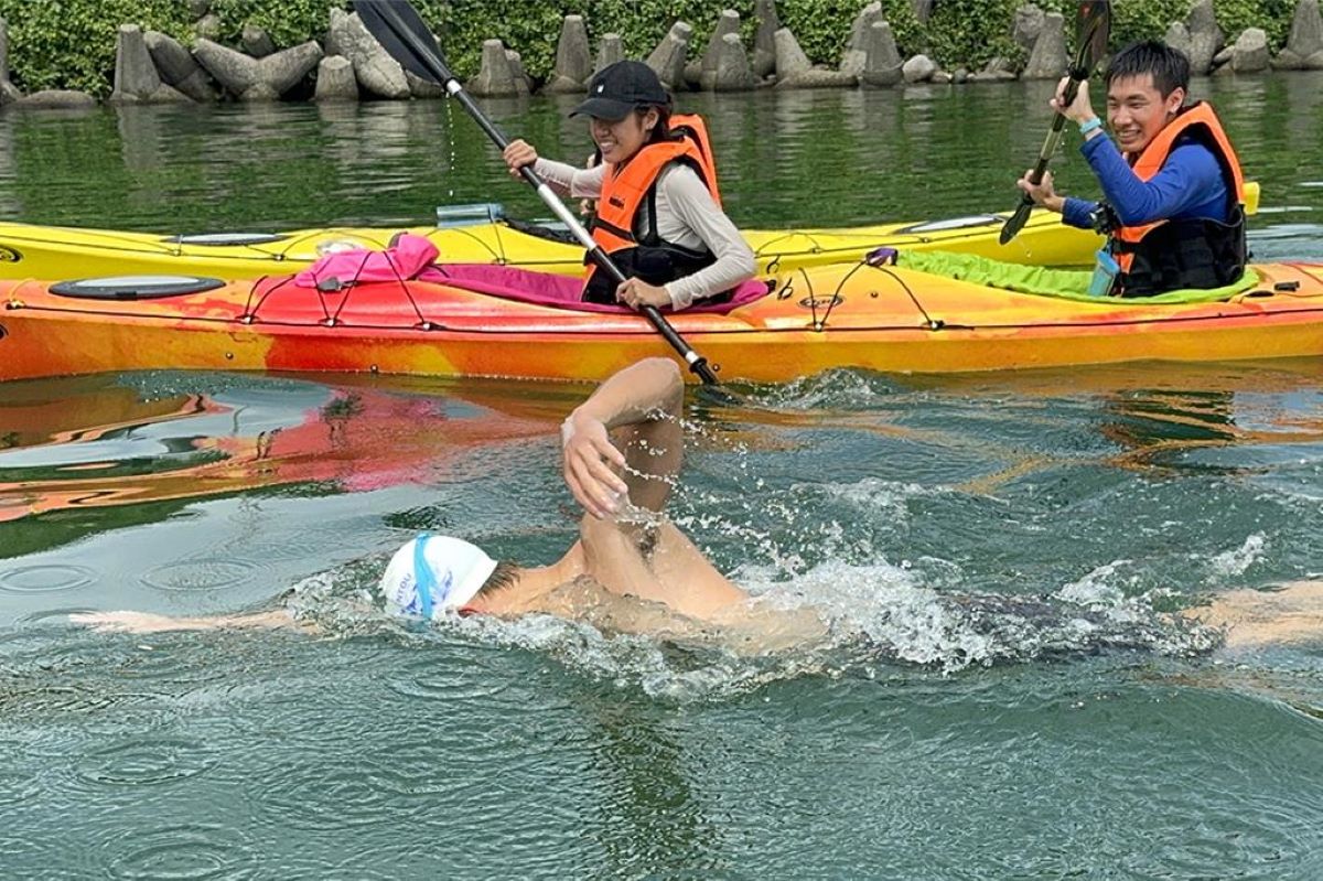 今年最特別的,是除了40名畢業生將透過獨木舟挑戰基隆嶼外,還有4名海大游泳隊畢業生選擇以泳渡的方式來完成畢業挑戰。這4名畢業生早在活動開始前2個月,便針對在海中長泳做集訓,除了體力及游泳技術外,還必須克服對於茫茫大海的恐懼及大自然的阻礙(如洋流、海浪及水母)才能完成這艱難的任務。