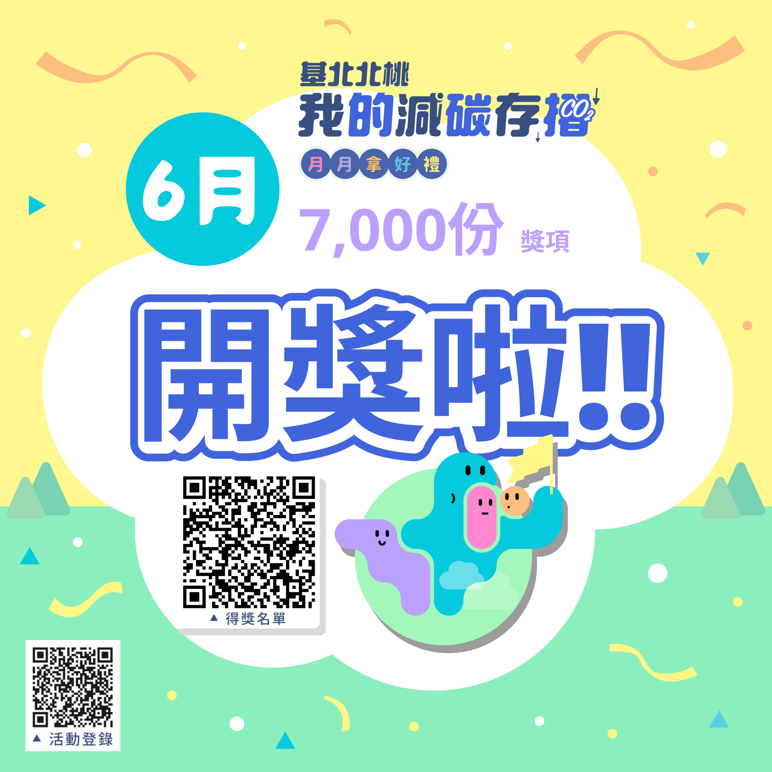 基北北桃「我的減碳存摺」全民運動6月得獎名單於今日公布!恭喜各位得獎者,得獎名單請詳活動官網([連結])。月月抽(含地方特色獎項)、週五加碼抽的得獎者,悠遊卡公司將於7月31日前以簡訊通知;滿額抽的得獎者將以APP訊息推播方式通知領取,請幸運得獎者留意您的手機訊息!活動第1季(4-6月)大獎已全數開出,感謝民眾熱情參與,第2季(7-9月)也非常豐富,有MacBook、PS5、藍芽耳機、全聯禮券等超過7,000份好禮等著你!
