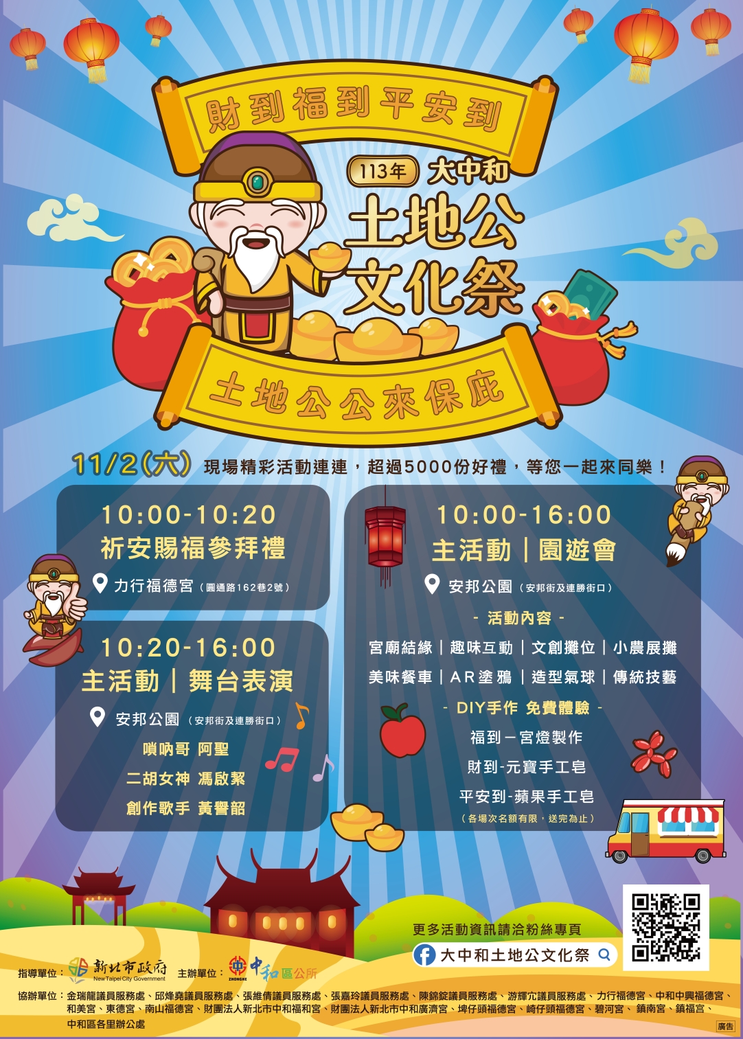 11月2日早上10點在力行福德宮進行祈安賜福參拜,儀式後轉場至安邦公園,預計10點20分由YouTuber「嗩吶哥阿聖」擔綱開場,邀請二胡女神馮啟絜、中和國光北管國樂團及創作歌手黃譽韶參與活動演出,還有在地學校社團表演。而主副祀土地公的力行福德宮、中和中興福德宮、和美宮、東德宮、南山福德宮、崎仔頭福德宮、碧河宮、鎮福宮也至現場展示特色,結緣品包括:土地公餅、平安米、聚寶盆、平安水、鑰匙圈、招財金元寶吊飾,還有其他各式小物,總計超過5,000份好禮等大家來拿,期許在土地公福神共同守護下,庇佑大家健康快樂。