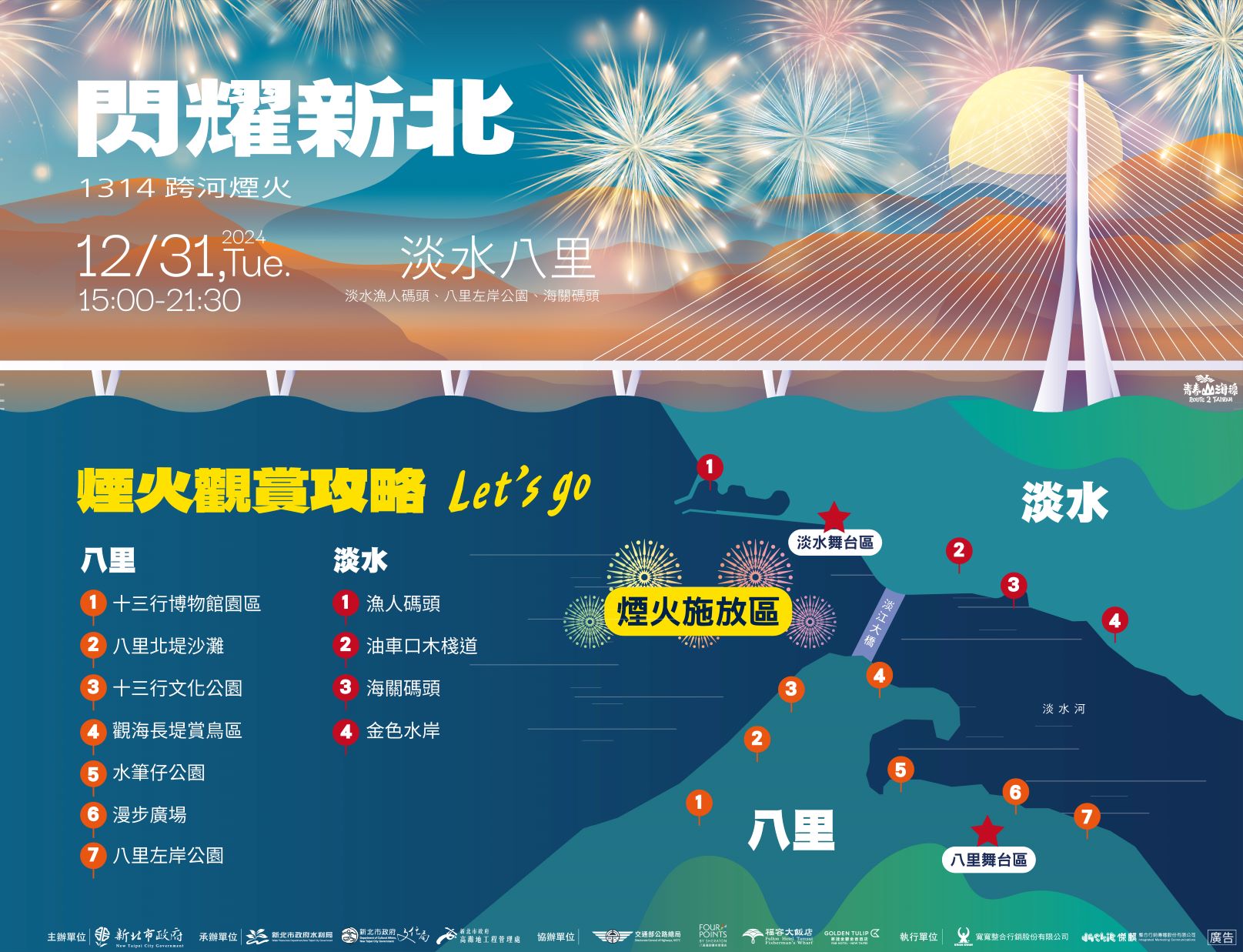 為了讓市民能夠更好地欣賞煙火,新北市政府推薦了11個最佳觀賞點,包括淡水金色水岸河濱公園、淡水海關碼頭、油車口木棧道、漁人碼頭(觀景平台、觀海廣場),以及八里側的左岸河濱公園、水筆仔公園、觀海長堤賞鳥區、十三行文化公園、十三行博物館、八里北堤沙灘、八里左岸漫步廣場等。處長黃裕斌也分享一個私藏的觀賞點,今年四月完工的八里左岸米倉無限公園,這裡不僅可欣賞到淡水河的河岸景色,還可一覽淡江大橋的壯觀,又可避開淡水人潮,是不錯的選擇!