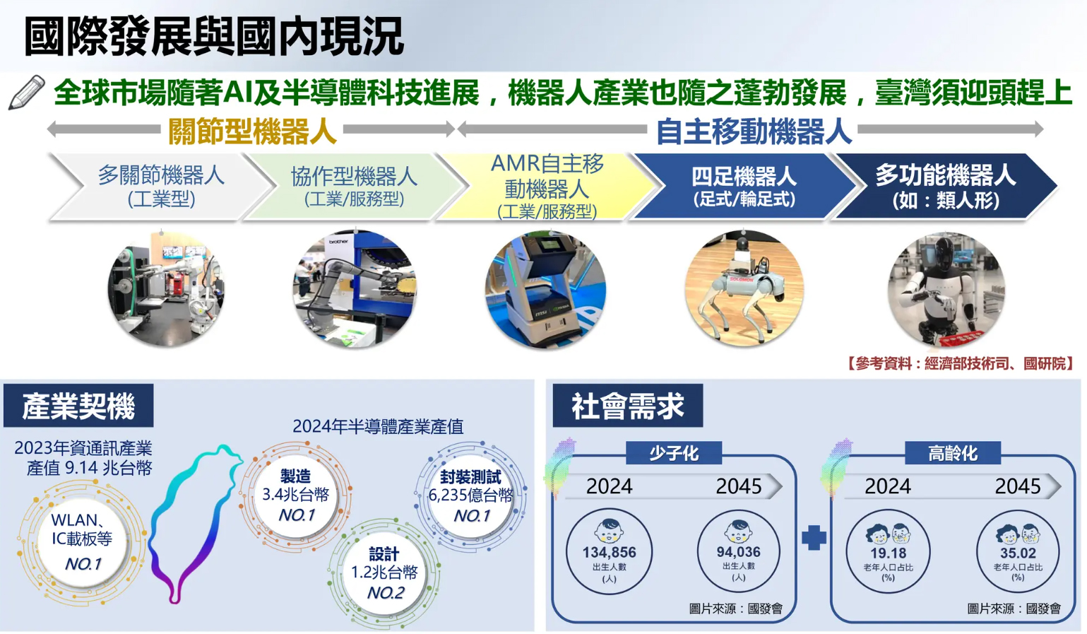 行政院長卓榮泰昨(15)日於行政院會聽取國家科學及技術委員會「AI新科技-智慧機器人計畫」報告後表示,在產官學研共同努力下,我國在半導體及資通訊科技領域已有相當顯著成果,讓智慧機器人產業發展具備良好基礎條件。