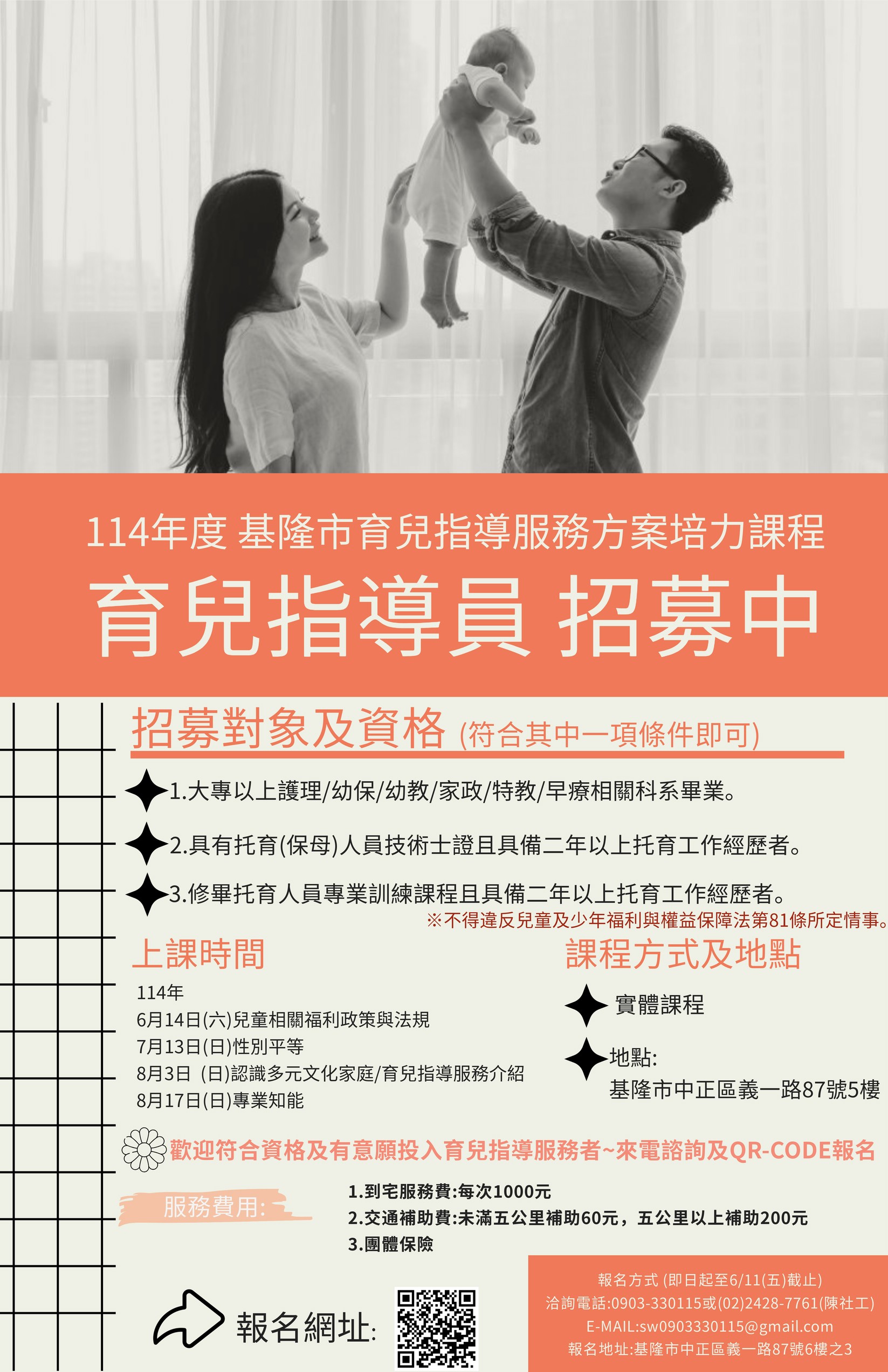 最後,為鼓勵民眾參與並投入服務,育兒指導員完成培訓後,每次到宅服務費為新台幣1,000元,另有提供交通津貼與團體保險補助,以保障服務過程中的安全與權益。即日起至6月11日止開放報名,名額有限,歡迎符合資格並對育兒服務有熱忱的民眾踴躍參與。詳細資訊可掃描活動海報QR Code或洽詢主辦單位(社團法人中華民國愛加倍社會福利關懷協會),