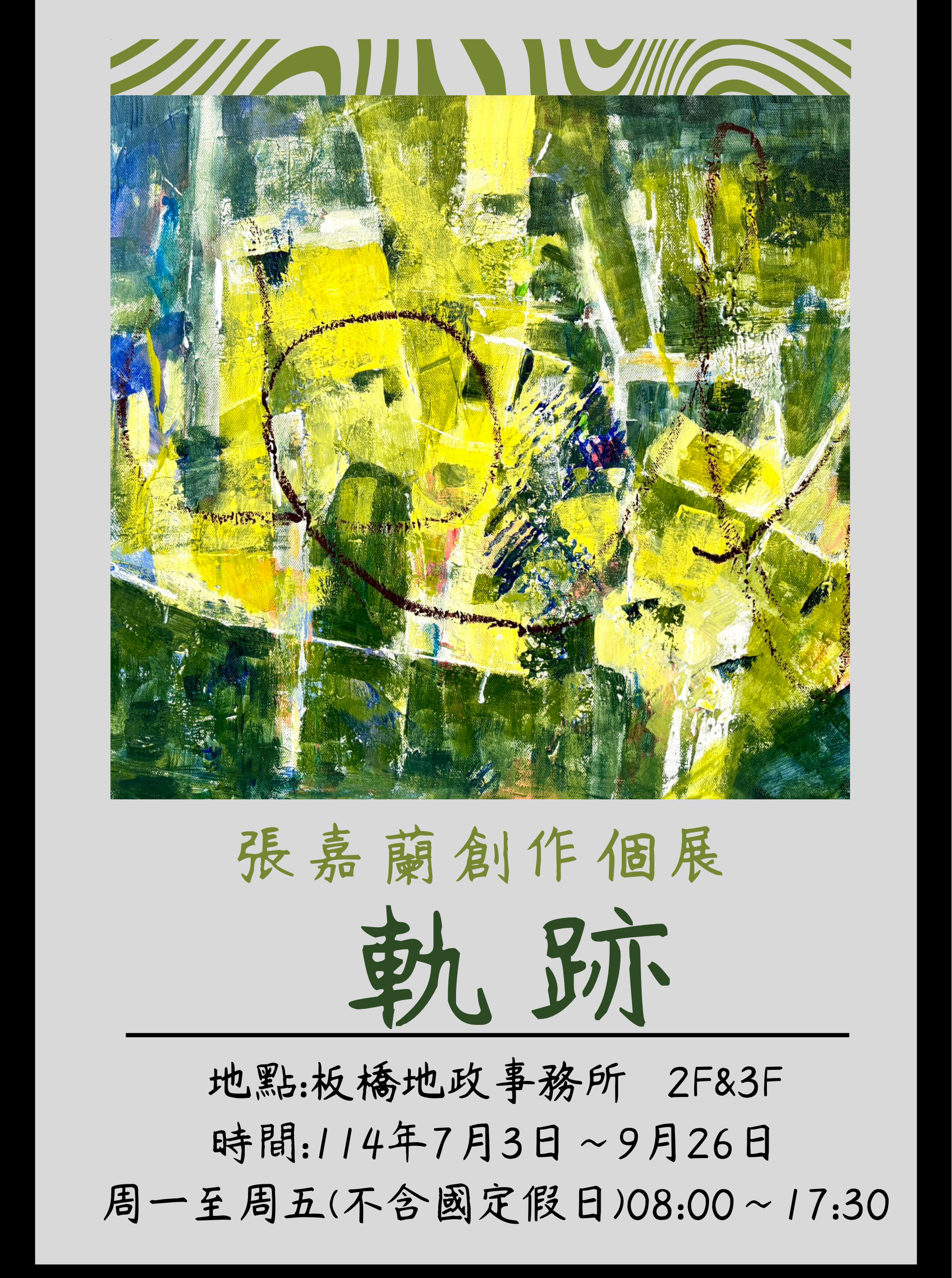 新北市板橋地政事務所藝文走廊自114年7月3日起至9月26日止,於該所2、3樓展出「軌跡」張嘉蘭創作個展,歡迎至所洽公民眾及熱愛藝文人士駐足片刻,享受一場視覺盛宴!