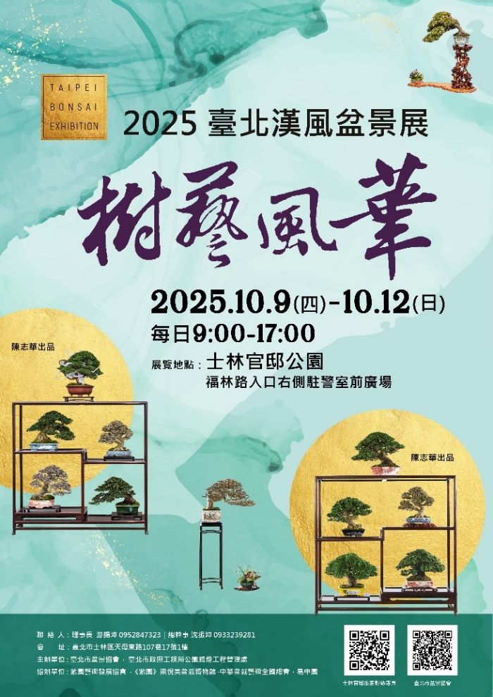 中秋雙十連假,不妨來趟充滿綠意與藝術的城市小旅行!「2025臺北漢風盆景展」將於10月9日至10月12日,在士林官邸公園盛大登場。本次展覽網羅全國名家精選之珍稀盆景,從數十年至百年以上的老樹到造型獨具的作品,展現東方園藝美學的極致韻味。